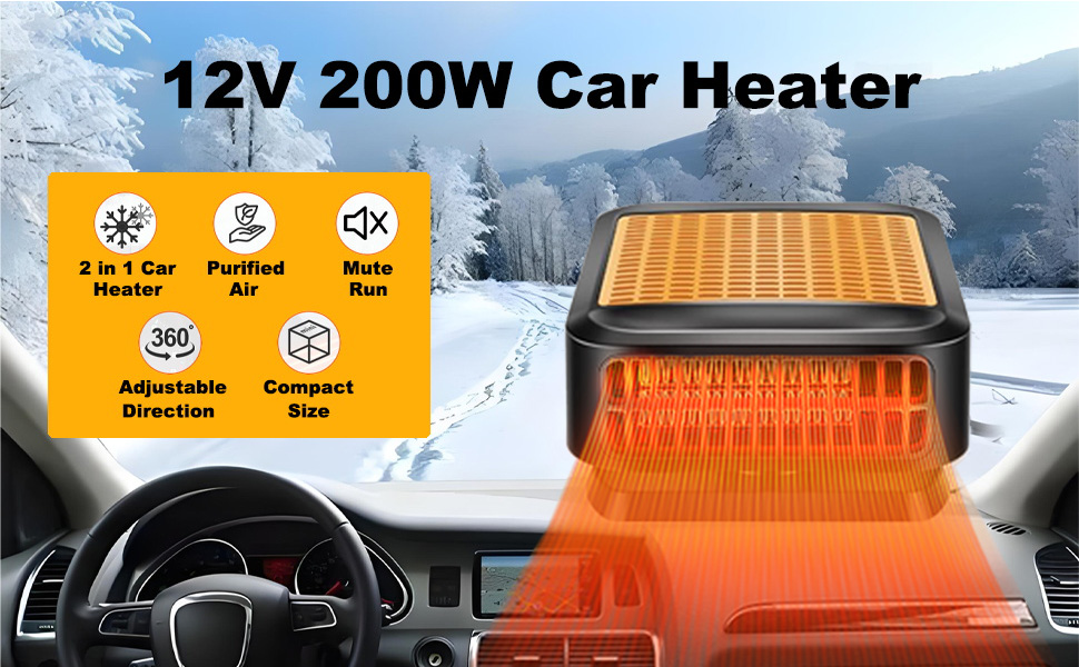 【2-in-1 Setting Mode】Experience the versatility of our 12V 200W Car heater,designed to cater to your specific needs.With two adjustable modes - Car Heating and Car Cooling - you can effortlessly tackle frost,mist,and fog on your car windshield and side window.Enjoy a clear and unobstructed view while driving, thanks to the multi-level adjustments that meet your unique requirements.Stay prepared for any weather conditions with this innovative car heater.