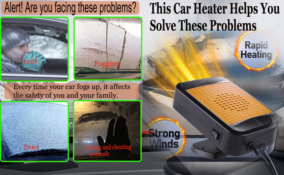 【Quick Heating】Experience quick and efficient warmth with our 2-second heating feature.No longer will you have to endure long waits in chilly weather.Our 12V heater allows for swift car warming and windshield defrosting,ensuring your comfort and clear visibility without delay.Stay ahead of the cold with our effective and fast heating solution.