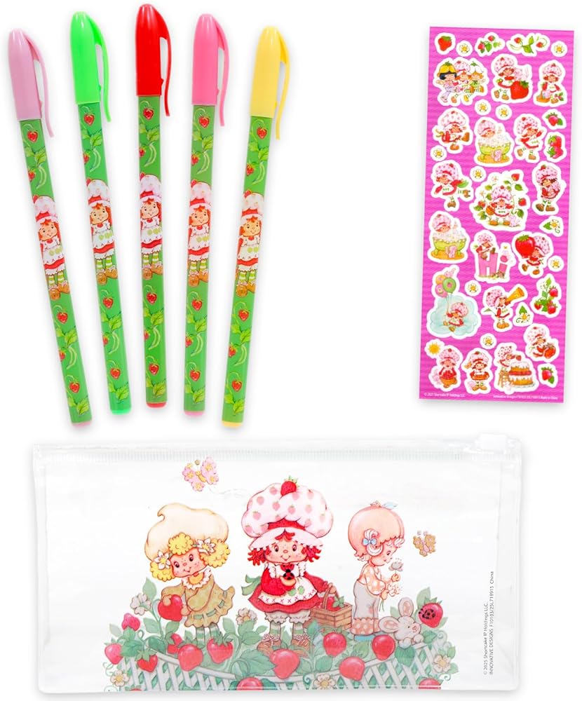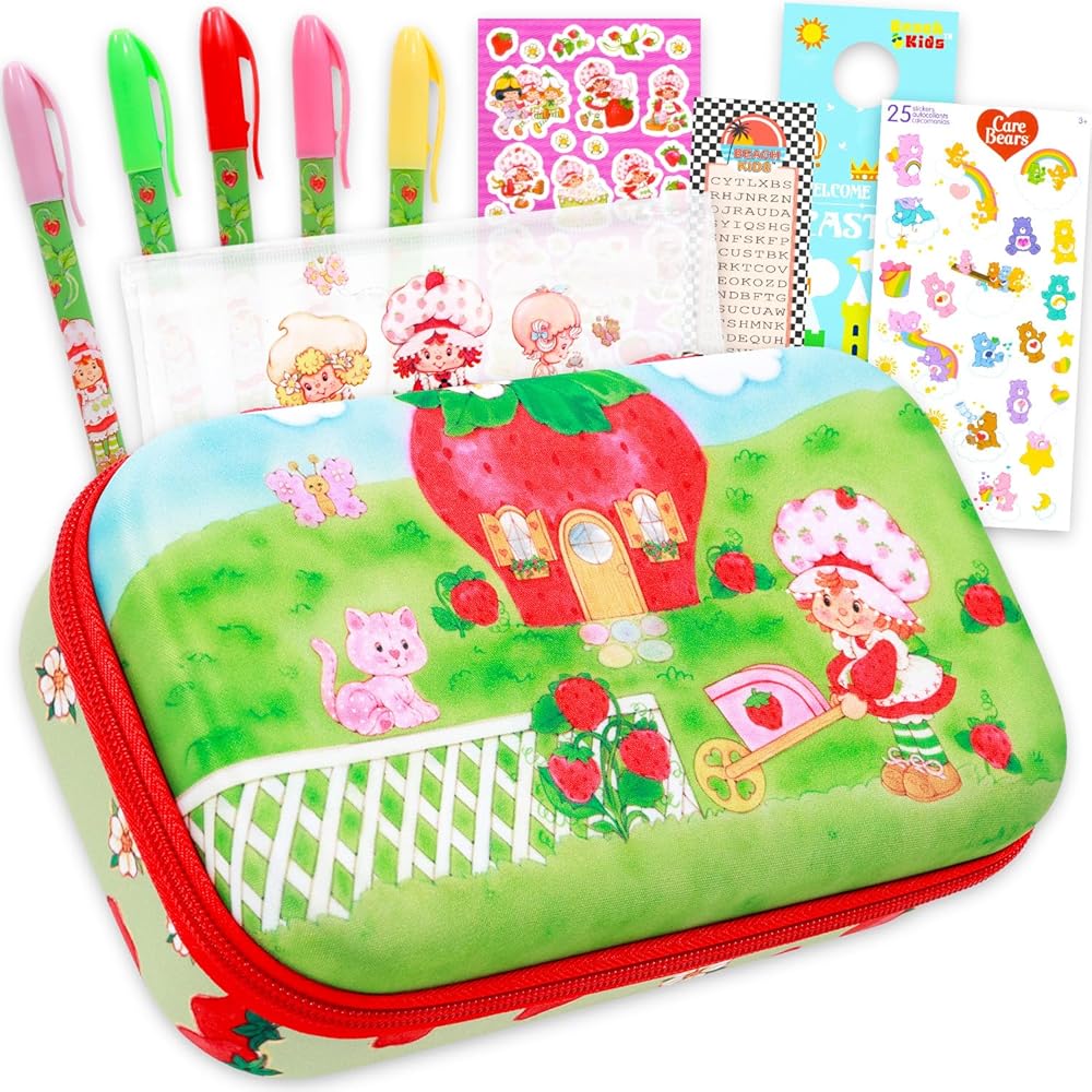 Strawberry Shortcake Pencil Box and Stationery Set - School Supplies Bundle with Pencil Case, Gel Pens, Stickers, More | Strawberry Shortcake Stationery Set for Kids, Girls, Toddlers. This Strawberry Shortcake school and office supplies set comes with 1 Strawberry Shortcake molded pencil and pen case measuring 5" x 2.5" x 8", featuring colorful Strawberry Shortcake artwork. This Strawberry Shortcake school set also includes Strawberry Shortcake pens. Perfect for fans as desk accessories, stationery accessories, office supplies, and school supplies. The molded pencil and pen container features colorful artwork of Strawberry Shortcake and is large enough to hold a variety of pens, pencils, highlighters, and more. Officially licensed Strawberry Shortcake school and office accessories for kids, teens, and adults also comes with Care Bears stickers, a word search bookmark, and a Beach Kids cat door hanger. WARNING: CHOKING HAZARD—Small parts. Not for children under 3 yrs.
