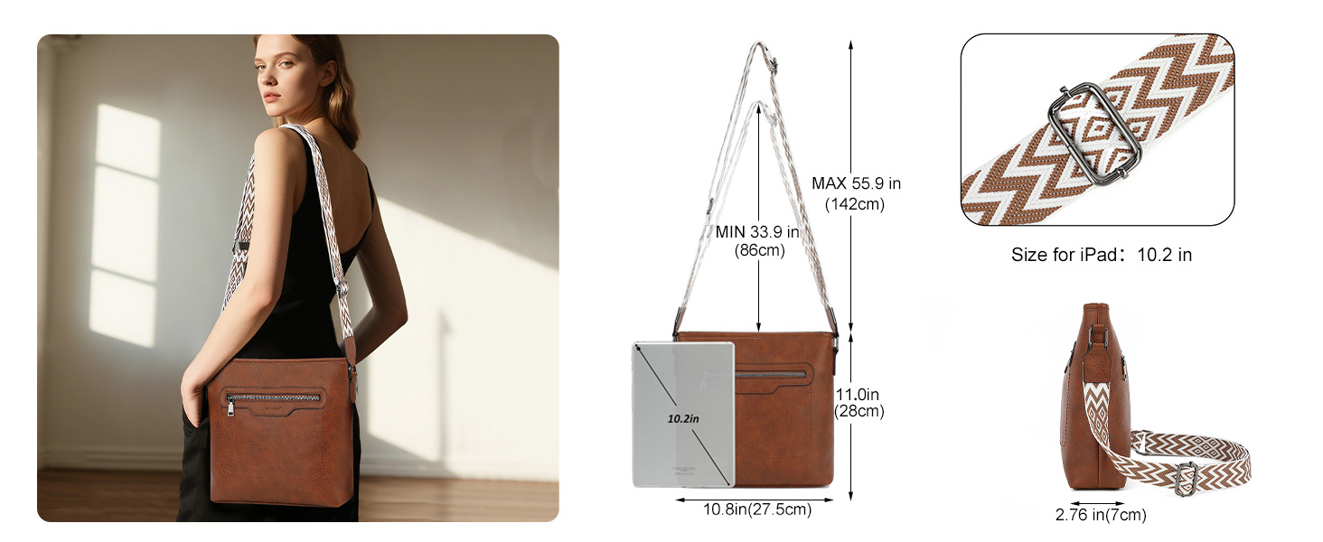 Travel Purse Size: The crossbody purse for women travel measures 11''(L)*2.8''(W)*10.8''(H). The shoulder strap is adjustable but not removable. The handbag crossbody adjustment range is 16.5-26 in.