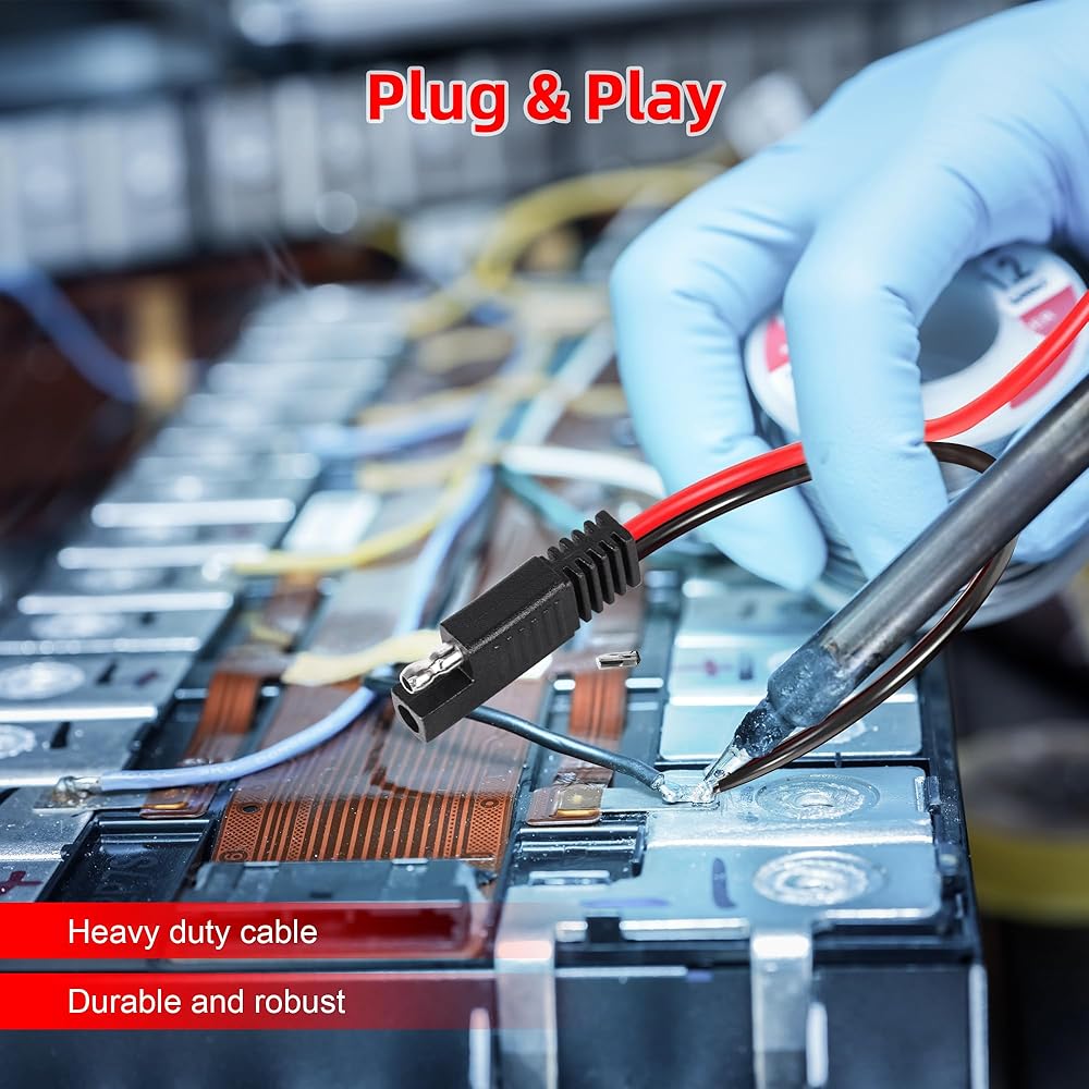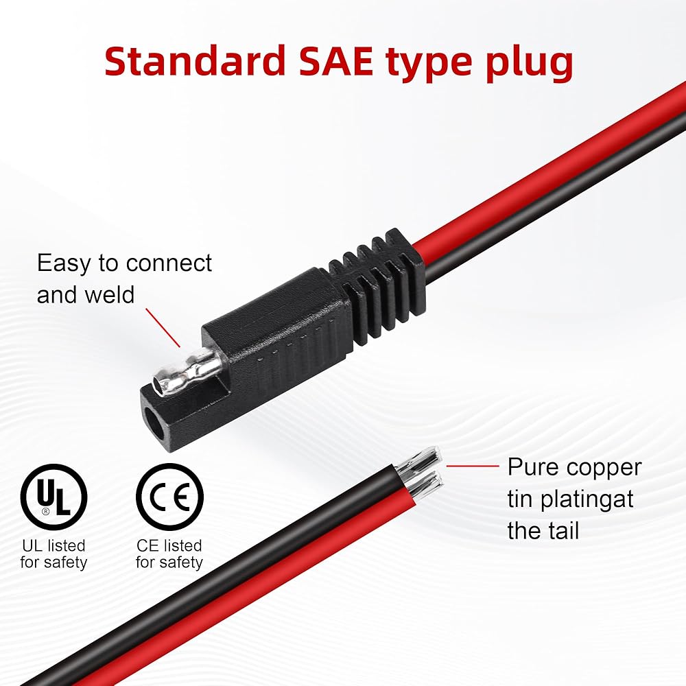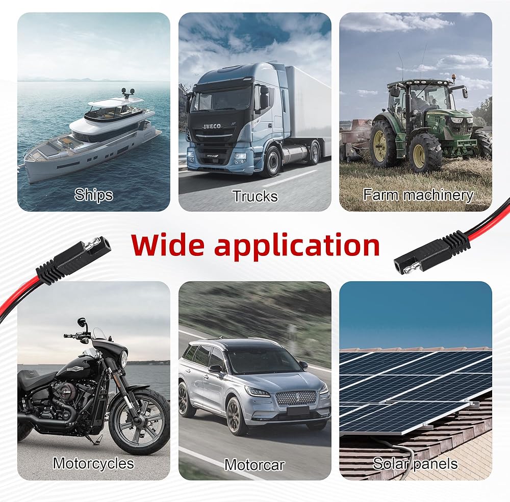 Wide Applications: The 14 AWG SAE power extension connector is ideal for motorcycles, cars, snowmobiles, batteries, solar panels, lawn mowers, ATVs, RVs, boats, trolling motors, tractors, and other equipment requiring SAE plugs. It saves both time and effort.