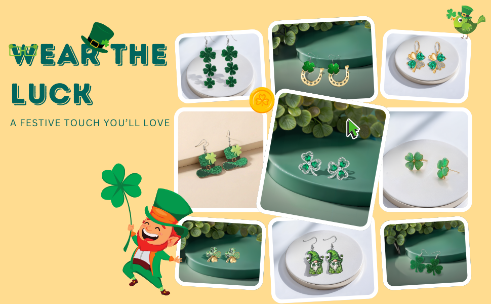 🍀 ST. PATRICK'S EARRINGS -- Those who adorn themselves with St. Patrick's Day Earrings will receive the blessings of the patron saint of Ireland, bringing good fortune on St. Patrick's Day.
