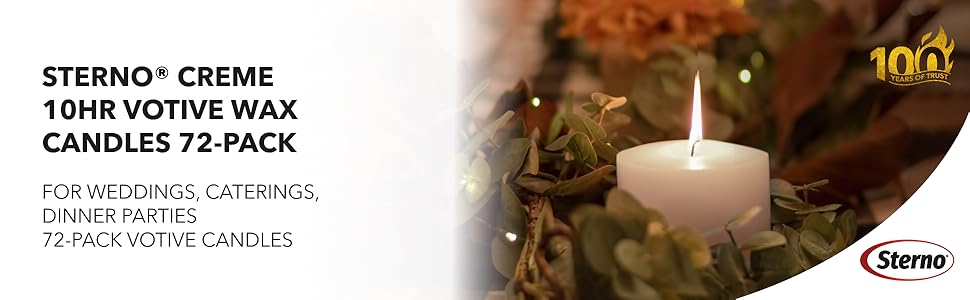 Redefine Fine Dining & Home Entertaining with Sterno Turn intimate gatherings and grand celebrations into successful events that will leave a lasting impression on guests with the 72-Pack Votive Candles from Sterno! For over 4 generations, Sterno has led the way in developing and producing portable food-warming products that have become integral to nearly every aspect of the American experience. Set a new trend in the realm of foodservice and home entertaining with straightforward, no-nonsense solutions from Sterno. Delivering Life-Enhancing Solutions to Our Valued Partners At Sterno, delivering true value through the quality of our products and the additional benefits of every enhancement we introduce is the cornerstone of our business. We actively engage with our philanthropic partners—Mercy Chefs, Marriott Bridges, and NRAEF ProStart—offering hands-on assistance, financial aid, and product support. Our reputation is built on being truthful, reliable, consistent, and responsive. This commitment to trust is matched by our dedication to innovation, as we strive to create problem-solving, experience-enhancing products for both foodservice professionals and consumers. Experience Century-Long Excellence in Entertaining Since 1914, when the maker of fine chafing dishes introduced Sterno Canned Heat, we've been improving the quality of entertaining. For over 100 years, can after can, Sterno has ensured that food is hot, safe, and delicious when it comes out of the kitchen. Experience the tradition and innovation of Sterno in every product we offer, and trust us to turn every event into a success with our reliable and innovative solutions.