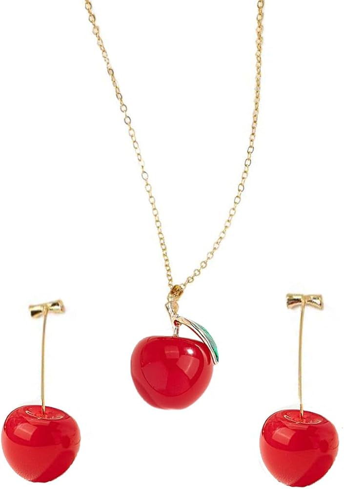 Cherry Earrings Necklace Set--You will receive a pair of cherry dangle earrings and a cherry charm necklace.Sweet appearance, bright red, youthful, fresh and enthusiastic fruit earrings. These fruit cherry earrings use the charm of crystal cherry to create a sweet and beautiful appearance.