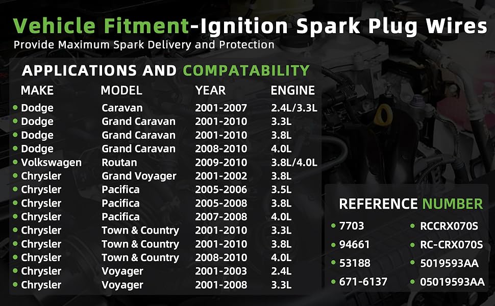 [Vehicle Fitment]:Compatible with Dodge:2001-2007 Caravan 2.4L/Caravan 3.3L, 2001-2010 Grand Caravan 3.3L, 2001-2010 Grand Caravan 3.8L, 2008-2010 Grand Caravan 4.0L, Compatible with Volkswagen:2009-2010 Routan 3.8L/Routan 4.0L, Compatible with Chrysler:2001-2002 Grand Voyager 3.8L, 2005-2006 Pacifica 3.5L, 2005-2008 Pacifica 3.8L, 2007-2008 Pacifica 4.0L, 2001-2010 Town & Country 3.3L, 2001-2010 Town & Country 3.8L, 2008-2010 Town & Country 4.0L, 2001-2003 Voyager 2.4L, 2001-2008 Voyager 3.3L