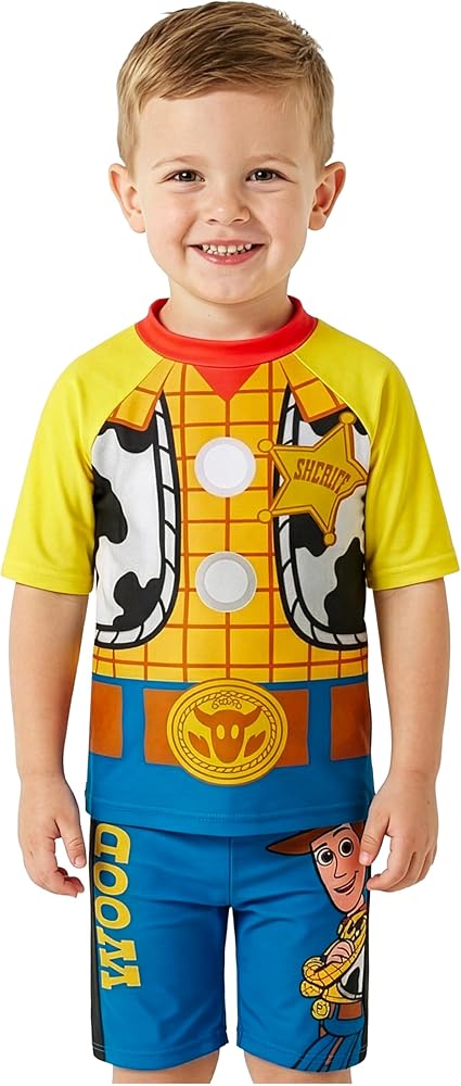 Woody Swim Set: Includes rash vest and swim shorts designed as a functional bathing suit for ages 3 to 7 for warm weather fun. Great for pool visits, holidays and beach days, swim suits are made for little Woody fans