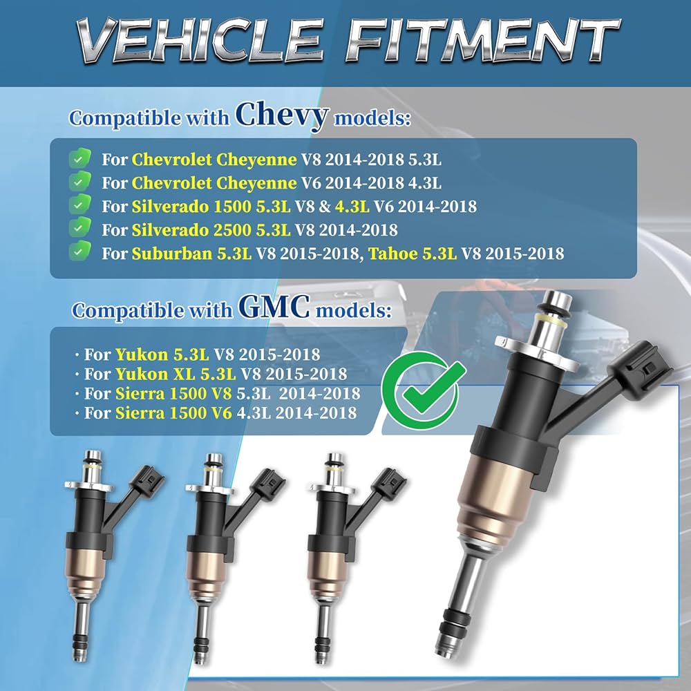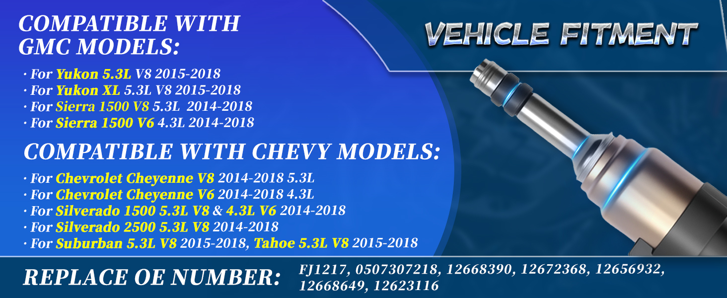 COMPATIBLE VEHICLE MODELS: For 2014-2018 Chevrolet Silverado 1500 5.3L V8, For 2014-2018 Chevrolet Silverado 1500 4.3L V6, For 2014-2018 Chevrolet Silverado 2500 5.3L V8, For 2015-2018 Chevrolet Suburban 5.3L V8, For 2015-2018 Chevrolet Tahoe 5.3L V8, For 2014-2018 GMC Sierra 1500 5.3L V8, For 2014-2018 GMC Sierra 1500 4.3L V6, For 2015-2018 GMC Yukon 5.3L V8, For 2015-2018 GMC Yukon XL 5.3L V8