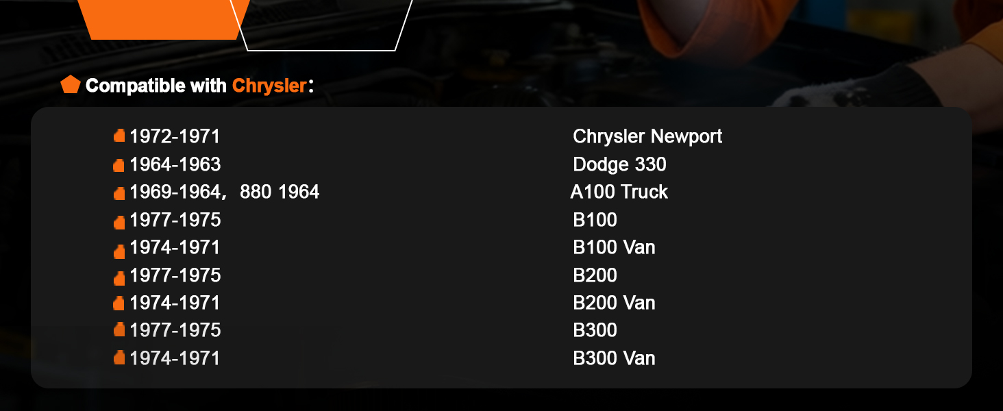 Vehicle Fitment: Fit for Chrysler Newport 1972-1971, Dodge 330 1964-1963, 880 1964, A100 Truck 1969-1964, B100 1977-1975, B100 Van 1974-1971, B200 1977-1975, B200 Van 1974-1971, B300 1977-1975, B300 Van 1974-1971 and More