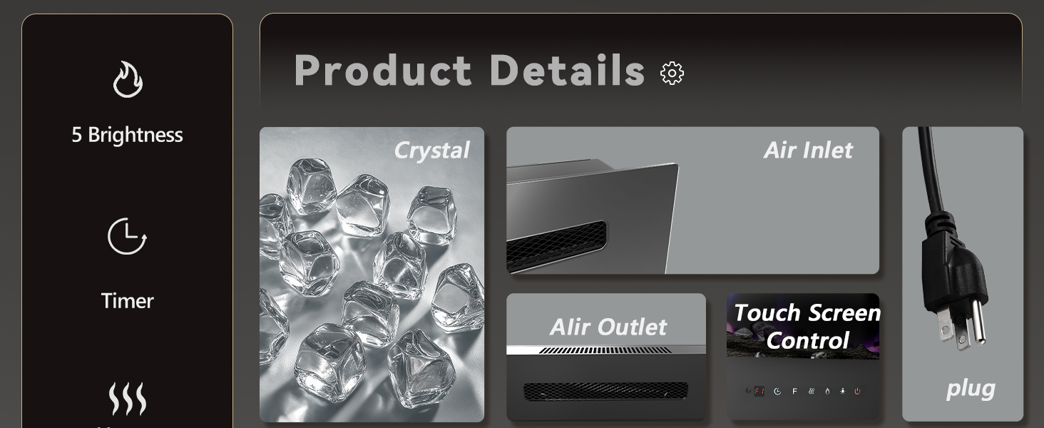 Dual Control & Quiet Operation: Equipped with both a remote control and a touchscreen, this wall fireplace electric with remote control lets you easily choose the features you need. The wall mounted electric fireplace heater operates at a low noise level of only 45 decibels, ensuring you can relax and enjoy a warm and cozy atmosphere without any disturbance