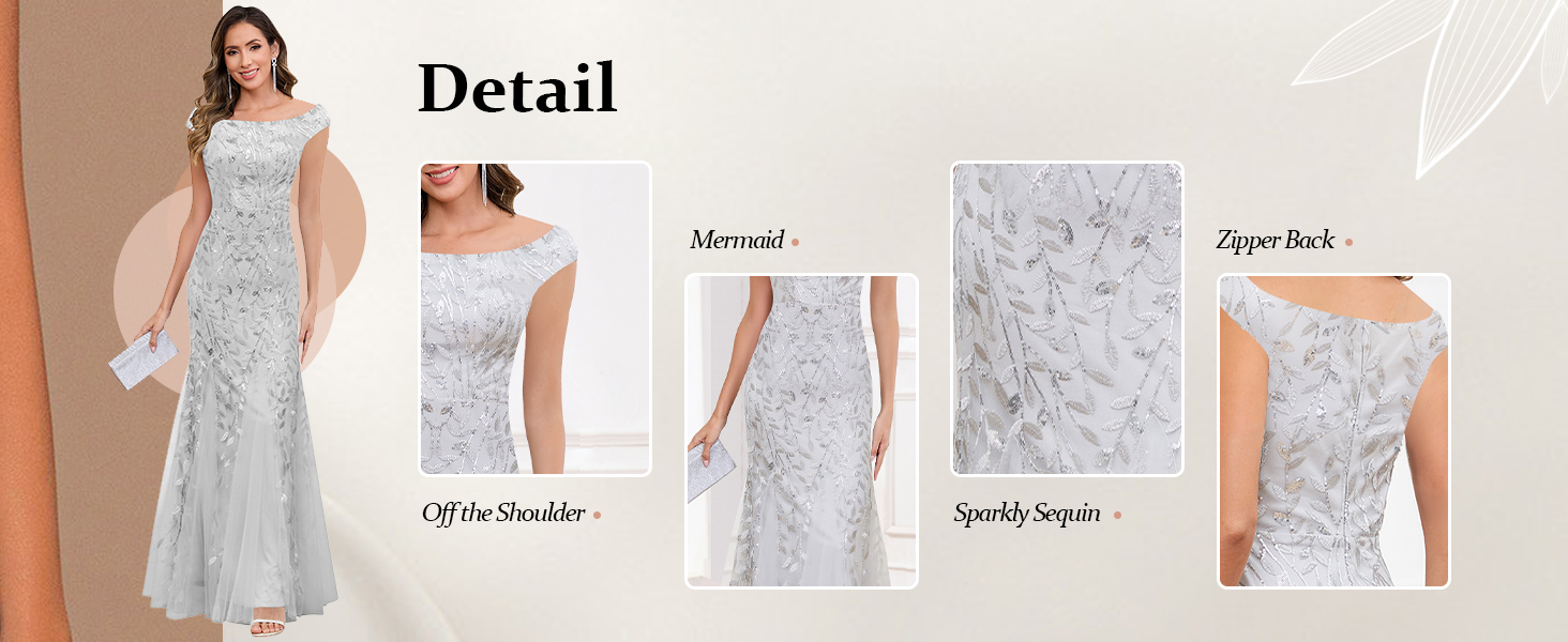 • Highlight:This formal dress is made of soft sequin lace fabric, with off-the-shoulder design that perfectly complements the curves and exudes elegance. It is perfect for weddings, dances, parties, or any formal occasion.