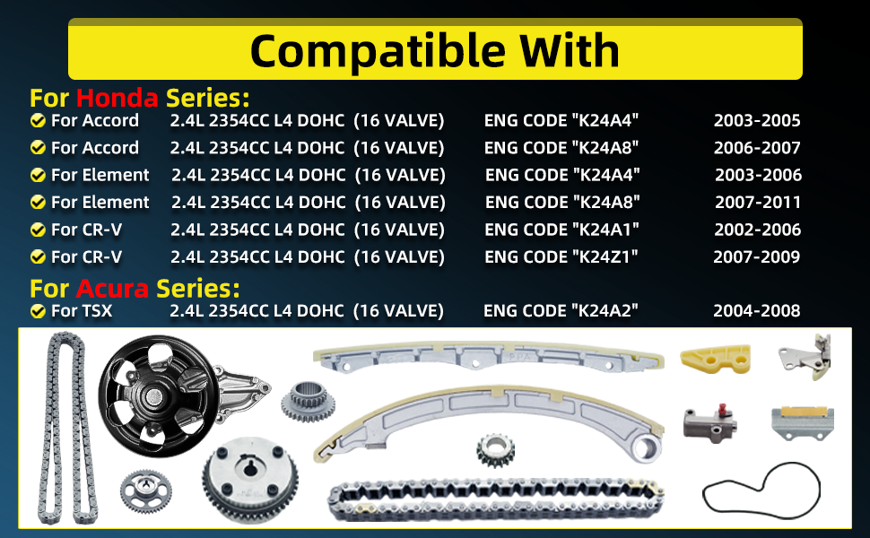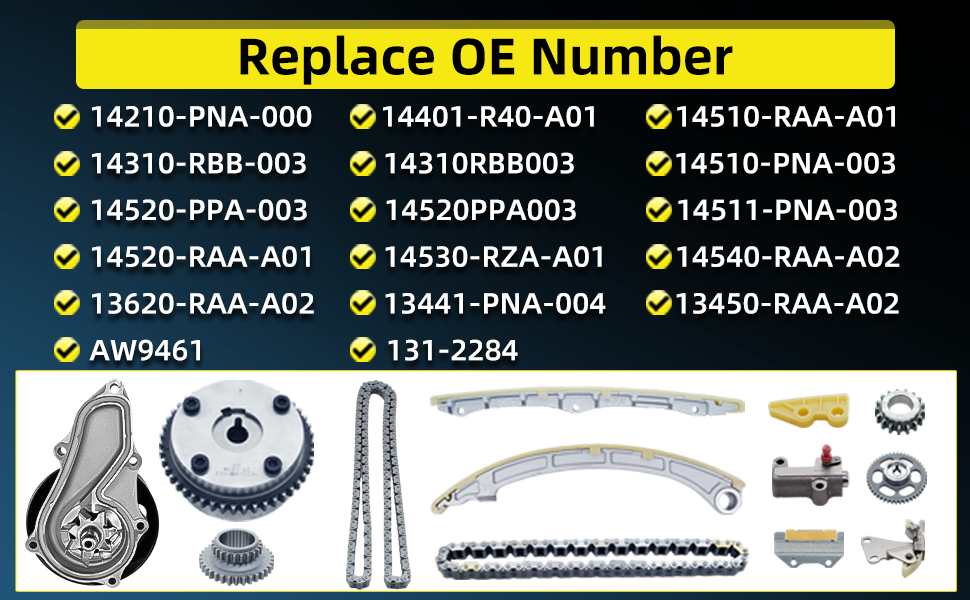 تتضمن الحزمة: 1 × 14210-PNA-000 2.4L سلسلة توقيت (176 وصلة)، 1x مضخة مياه AW9461 مع حشية، 1x سلسلة مضخة زيت (62 وصلة)، 1 × ضرس كام (46 سنًا - عادم)، 1 × ضرس كام (46 سنًا - مدخل)، 1 × ضرس كرنك (23 سنًا، 34 سنًا)، 1 × ضرس محرك مضخة الزيت (17 سنًا)، 1 × شداد، 1 × سكة توجيه (سكة ثابتة)، 1 × سكة توجيه (ثابتة - علوية)، 1 × دليل سلسلة مضخة الزيت، 1 × شداد سلسلة مضخة الزيت، 1 × سكة توجيه (ذراع الموتر)،