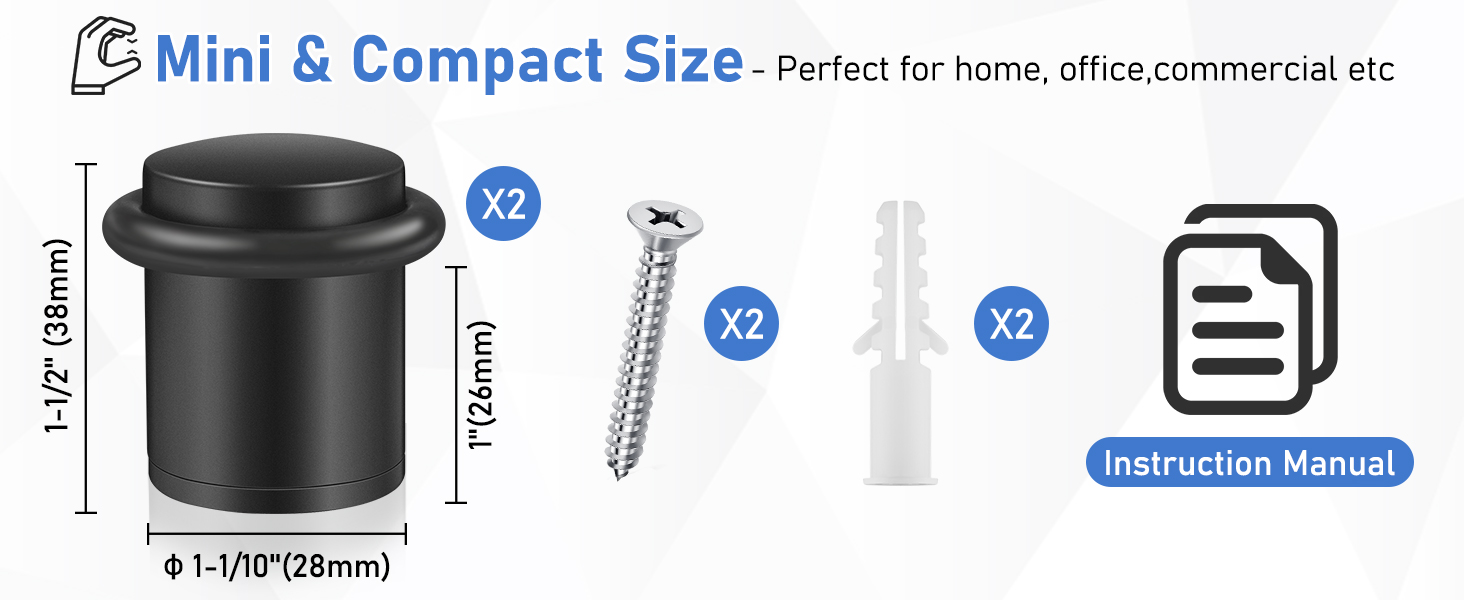 Small Size, Big Protection - Height: 1.5inches/38mm, diameter: 1.1inch/26mm. The compact door stop is made to fit in tight spots without sticking out, protect your walls from damage without messing with the room's layout