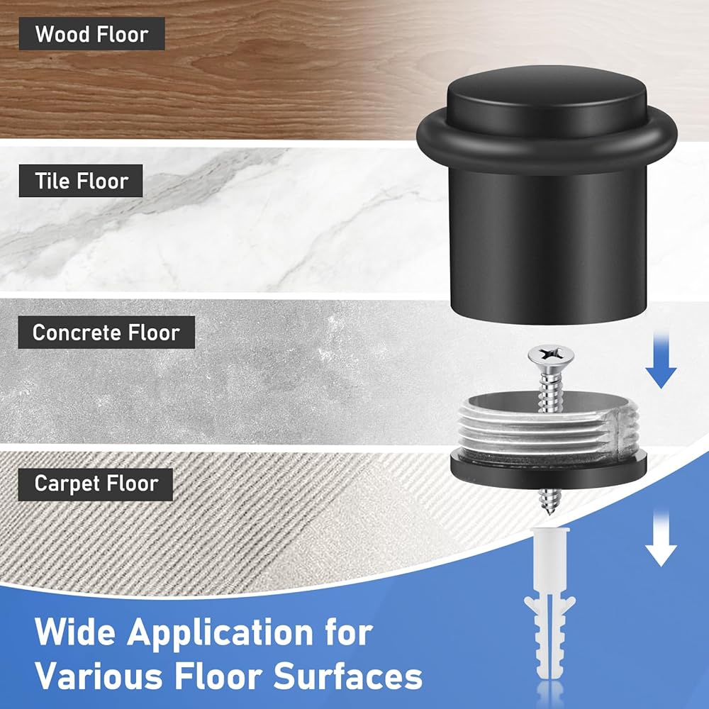 Easy to Install & Works on Any Floor: The set includes 2 floor door stop, screws and anchors, manual. Installs in minutes with basic tools—just screw it in and you're done. Works securely on wood, carpet, tile, concrete, or laminate floors