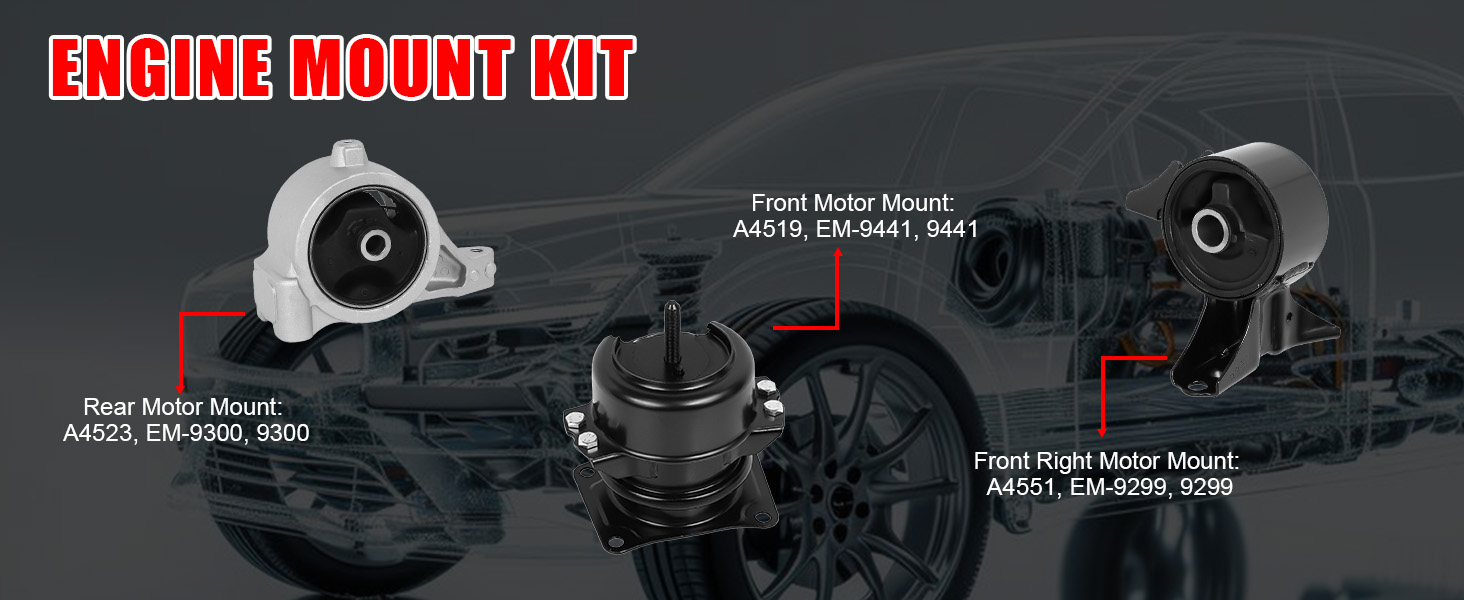 Package Included:1x Front Motor Mount: A4519, EM-9441, 9441,1x Front Right Motor Mount: A4551, EM-9299, 9299,1x Rear Motor Mount: A4523, EM-9300, 9300