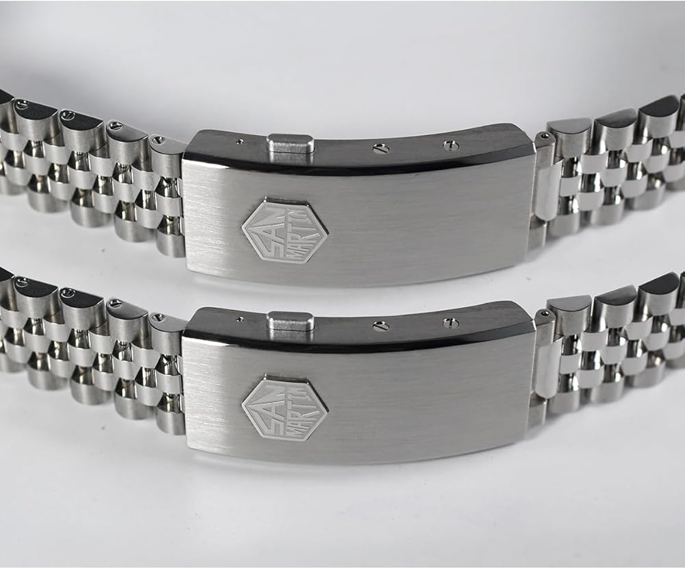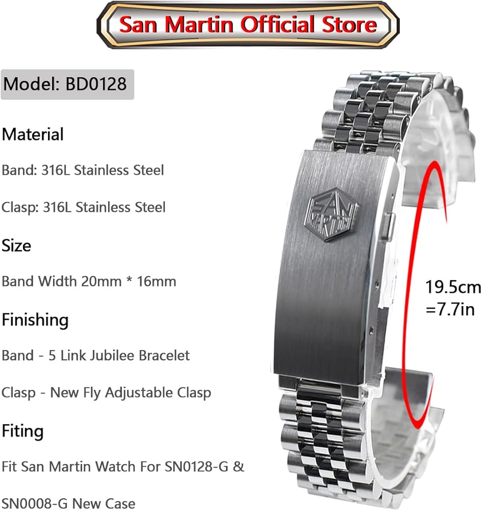 San Martin Watch Bracelet Stainless Steel Watch Parts For 20mm Curved End Links Fly Adjustable Clasp For SN0008 SN0128 Brand: San Martin Model: BD0128 Material:316L Solid Stainless Steel Size: 20mm* 16mm Length: 19.5cm =7.7in Clasp: New Fly Adjustable Clasp, With 3D Hexagon Logo Weight:About 70g The Set Includes: 1PC Stainless Steel Bracelet 2PC Spring Rod. Suitable For: SN0008/SN054/SN0109/SN0128 (With Hexagon San Martin Logo Crown Version Case)