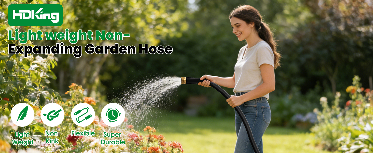 【Durable Non-Expanding Garden Hose】HDKing non-expanding garden hose features a fixed structure that delivers consistent, powerful water flow—critical for efficient gardening and cleaning tasks. Extremely lightweight, the 50FT size weighs only 3.2lb, paired with durable materials, making it easy enough for kids to handle (perfect for family gardening activities).Suitable for all outdoor scenarios: watering plants, washing cars, cleaning patios/decks, and bathing pets.