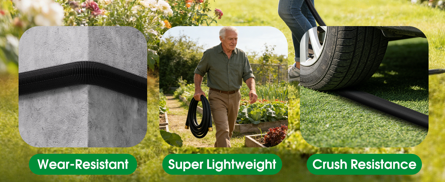 【Patented Anti-Kink & Easy Storage】Say goodbye to kinks and interrupted water flow with your garden hose! Our Non-Expanding hose features a patented helical winding structure and memory alloy guide rings, preventing 99% of common kinks. It's also easy to store—no tangling, quick to roll up, and saves space. Lightweight and flexible, this hose glides smoothly across yards, with no tedious sorting for storage, while the anti-kink design extends thegarden hose's service life.