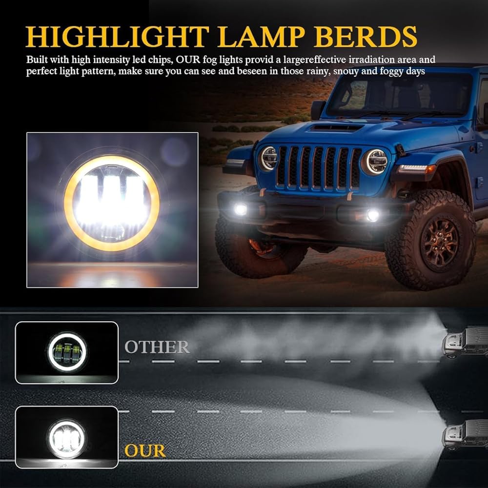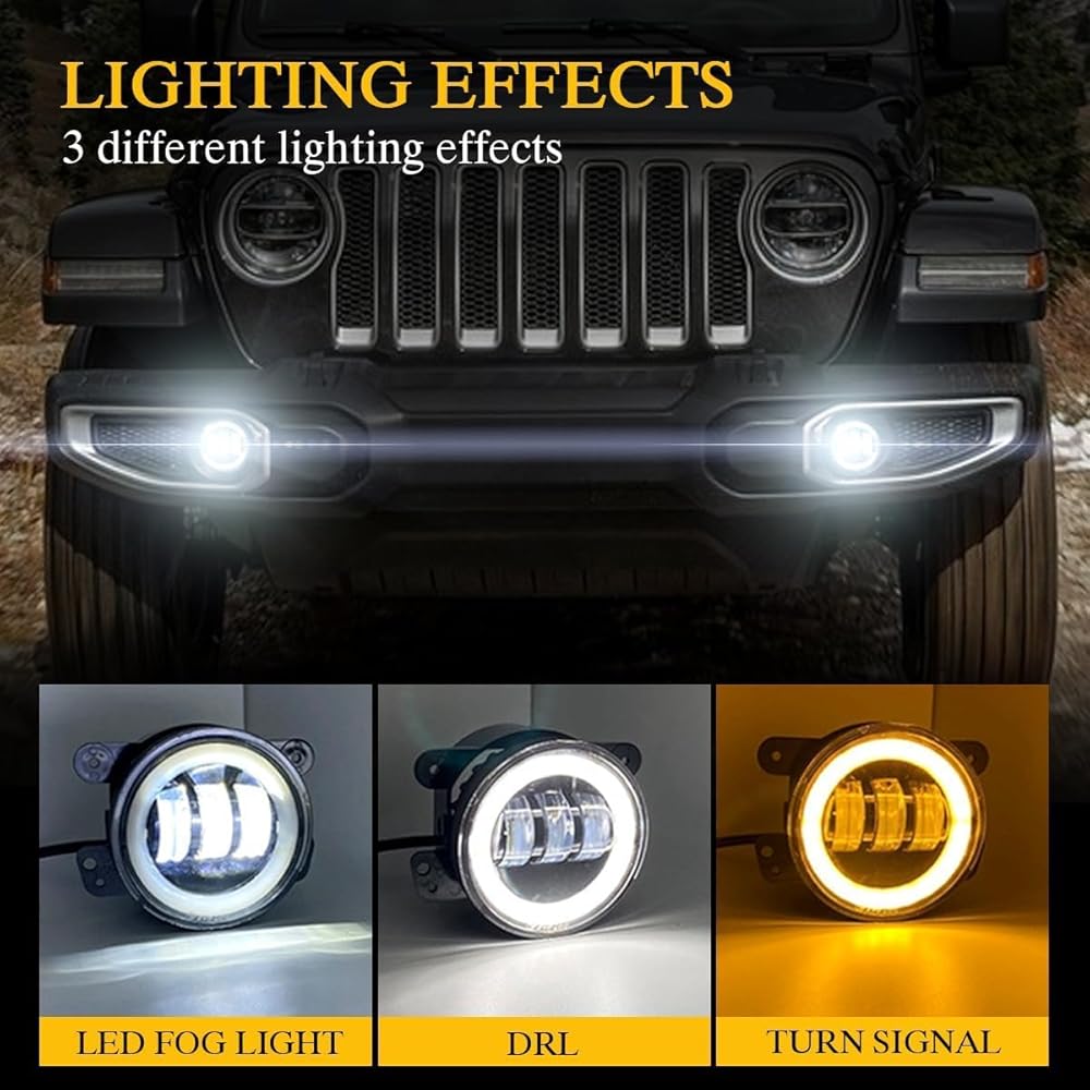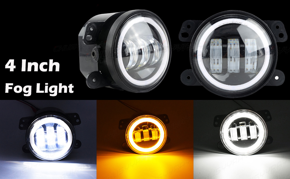 4 inch led fog light: 6500K fog light, with white DRL and amber turn dignal. Halo ring design, enhance the look and performance of your vehicle with the next generation of led lighting. Package including: 2pcs led fog light + 2pcs H11 conversion adapter wires