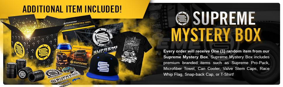 SUPREME MYSTERY BOX with Premium Item(s) Included With Every Purchase. It includes one premium branded item such as: Supreme Pro Pack Microfiber Towel Can Cooler Valve Stem Caps Race Whip Flag Snap-back Cap or T-Shirt! *Supreme Mystery Box Item is selected at random at the full discretion of Supreme Suspensions.