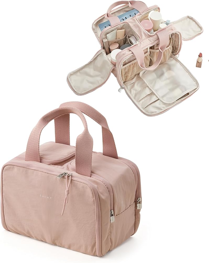 EACHY Travel Makeup Bag with Handle, Large Capacity Makeup Organizer, Waterproof Cosmetic Bag for Women, Wide-Open Design, Portable Toiletry Case for Travel, Accessories, and Essentials (Pink)
