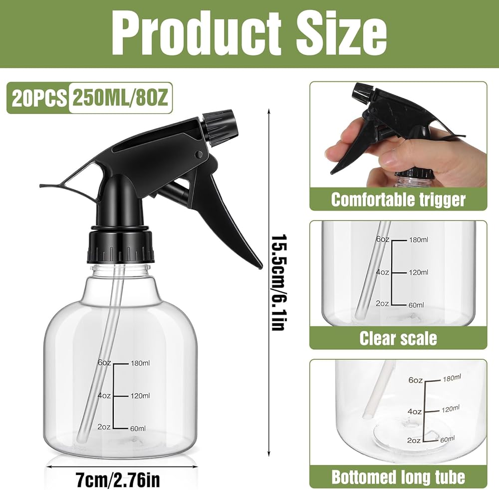 Specifications & Quantity :The package has 20 transparent plastic empty spray bottles, each 8 oz (250 ml). With a 2.76-inch bottom diameter and 6.1-inch height, they're easy to handle. Sturdy plastic lets you see contents clearly for quick identification