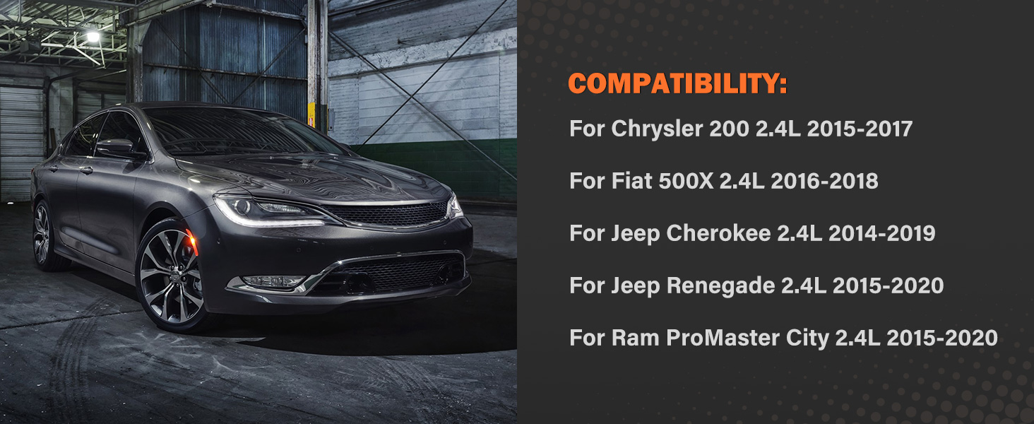 Fitment: Compatible with Chrysler 200 2.4L 2015-2017; Compatible with Fiat 500X 2.4L 2016-2018; Compatible with Jeep Cherokee 2.4L 2014-2019; Compatible with Jeep Renegade 2.4L 2015-2020; Compatible with Ram ProMaster City 2.4L 2015-2020;