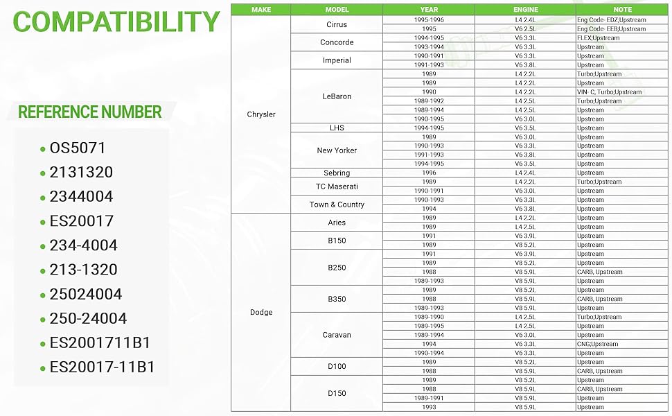[Vehicle Fitment]:Compatible with Maserati 1989-1991, Town & Country 1990-1994; Compatible with Dodge Aries 1989, B150 1989 1991, B250 1988-1993, B350 1989-1993, Caravan 1989-1995, D100 1988-1989, D150 1988-1991, D250 1989-1993, D350 1988-1993; Compatible with Chrysler Cirrus 1995-1996, Concorde 1993-1995, Imperial 1990-1993, LeBaron 1989-1995, LHS 1994-1995, New Yorker 1989-1995, Sebring 1996