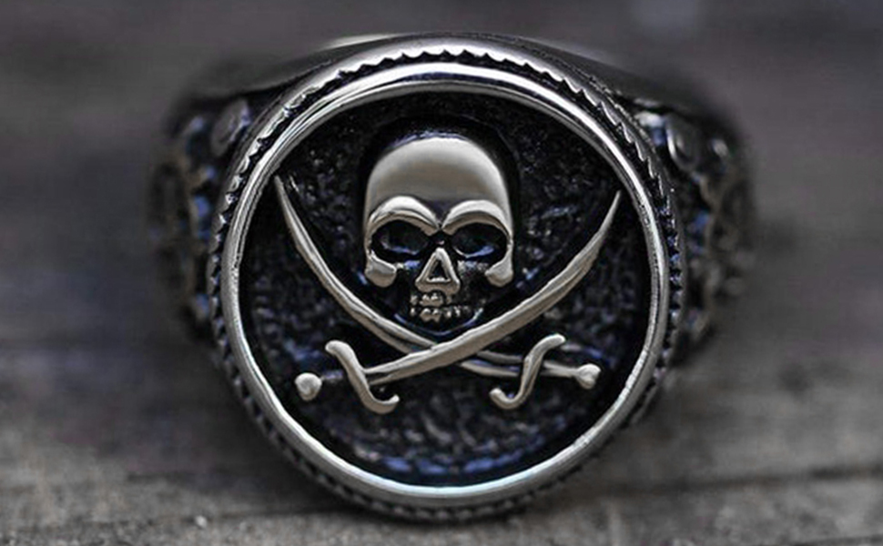 Pirate skull crossbones jolly roger ring made of 316L Stainless Steel,Masculine and Cool.Antique black finish.Never Rust or Green Finger,Hypoallergenic.Strong and Durable, The three-dimensional carved pirate skull pattern and the vintage and old silver alloy make it full of vicissitudes.