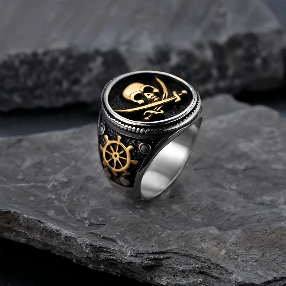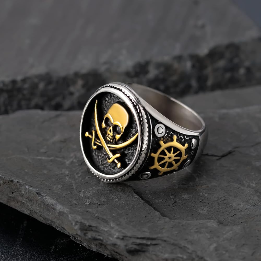 The Skull Captain is a magical pattern. Pirate ring with skull and rudder signet with Jolly Roger Symbol is gothic statement ring, brutalist style silver mens jewelry.This skull ring can bring good luck to the wearer and make the wearer more attractive.