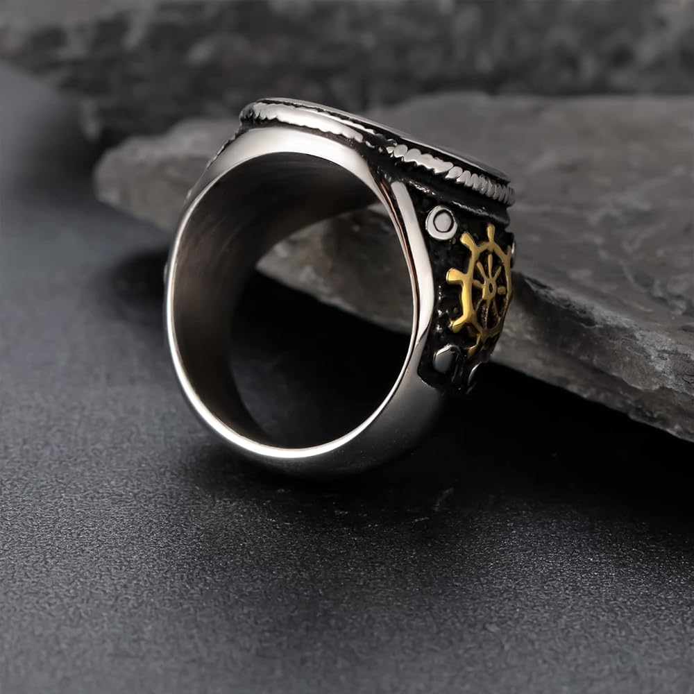 This silver pirate jewelry is distressed, darkened, and includes Rudders on the sides. A great men's wedding ring or a rad everyday ring for the pirate in your life.