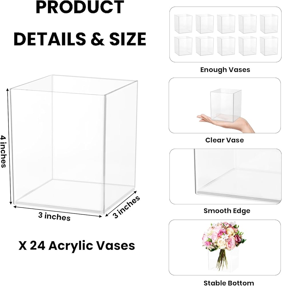 24 Pack Acrylic Vases for Centerpiece, Acrylic Cube Plastic Flower Vase Bulk Succulent Pots Planters Clear Small Square Opening Plastic Vases for Centerpiece Wedding Party Home Office, 4 x 3 x 3 Inch