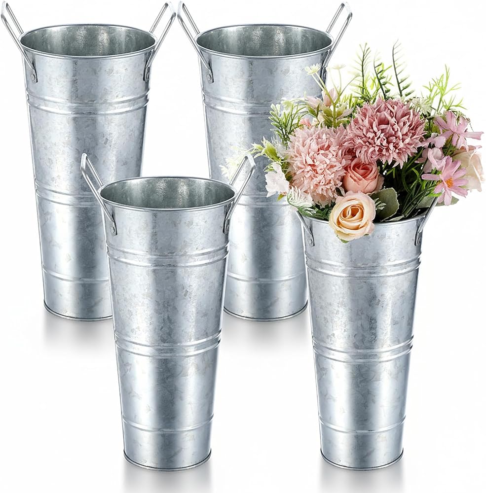 4Pcs Galvanized Metal Vases, 10 Inch Farmhouse French Flower Bucket Vases with Handles, Rustic Tall Flower Buckets for Home Decor and Wedding, Table Centerpiece Decorations