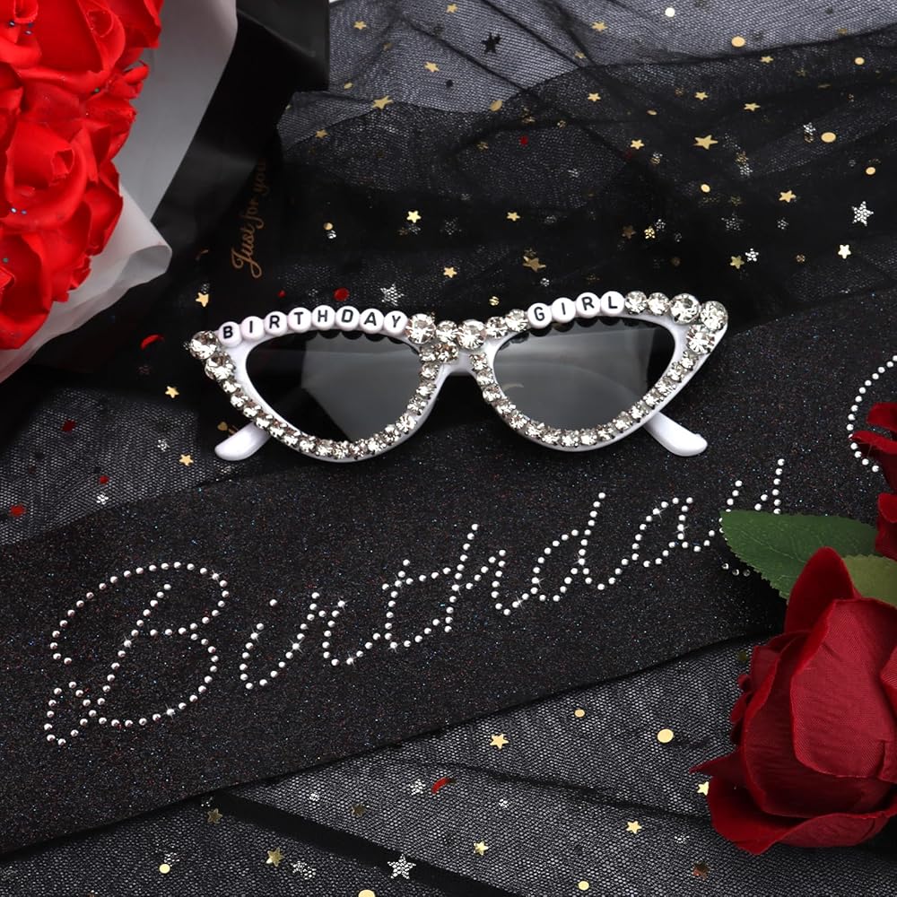 CUBACO Birthday Girl Sash and Sunglasses, Silver Birthday Party Decorations for Women Black Decorations Sweet 16 18th 21st 25th 30th 40th 50th Accessories Gifts Party Favors Supplies
