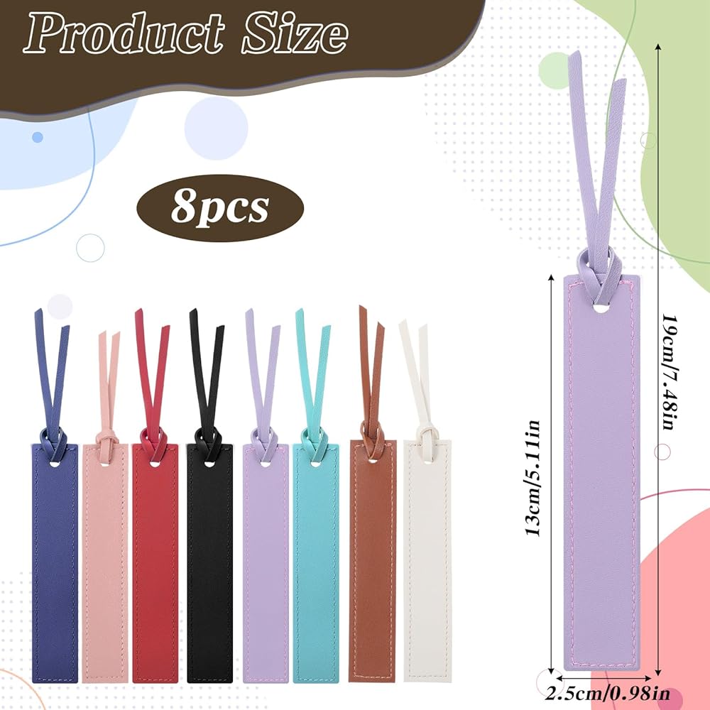 Complete Package: You will receive 8 pieces of finely stitched leather bookmarks in a set of distinct colors, including black, wine red, light blue, pink, purple, beige, dark blue, and brown. Each bookmark measures 7.48inch in total length with a 5.1x1inch main body, providing sufficient quantity and variety to meet different personal preferences and reading needs