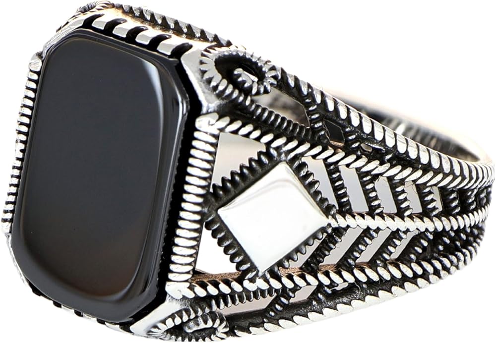 Own the room with a ring that's equal parts bold and refined. This men's silver-plated stainless steel ring showcases a striking black onyx stone in a cushion/rectangular profile, framed by meticulous chevron engraving and a distinctive square accent on the shoulders. Crafted on sturdy stainless steel and finished with tarnish-resistant silver plating, it's designed for everyday reliability without sacrificing style. The comfort-fit interior glides on smoothly and stays comfortable through long days and late nights. Whether you're elevating a suit or sharpening a tee-and-jeans look, this onyx signet ring brings presence, polish, and personality to your collection. Made in Turkiye
