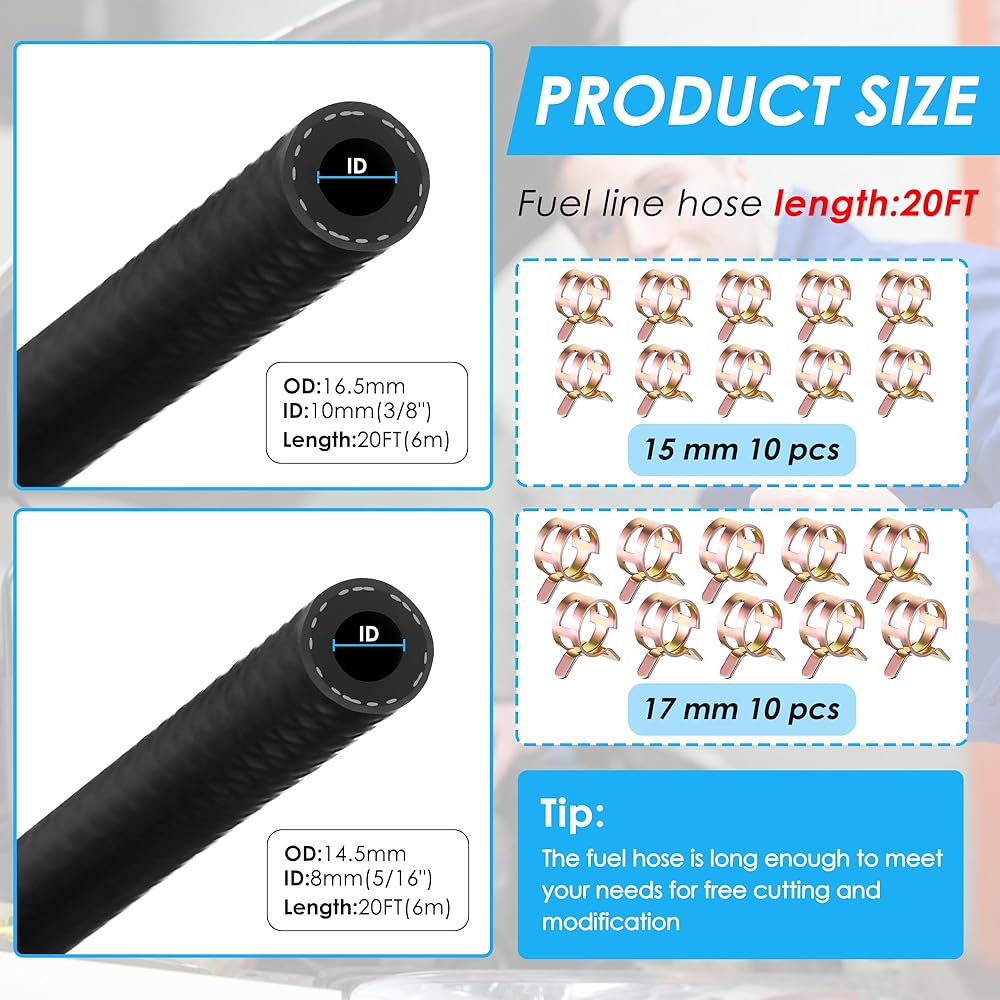 20Ft 2 Sizes Fuel Line Hose Kit - 3/8" 5/16" ID NBR Rubber Fuel Hose with 20Pcs Clamps High Performance 300PSI for Tractors, Small Engines, Lawn Mowers Automotive Engines