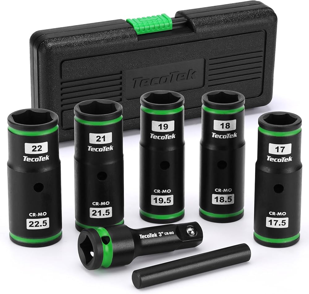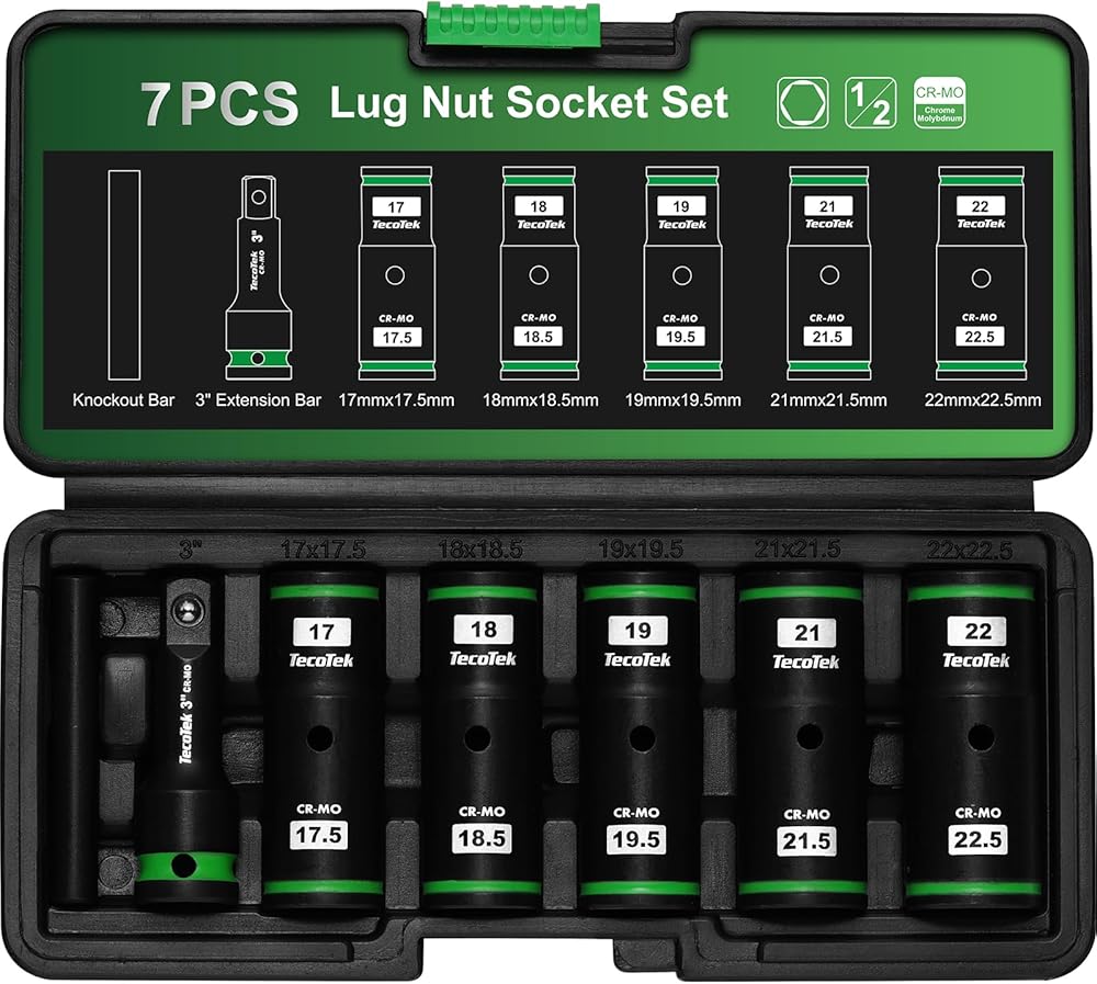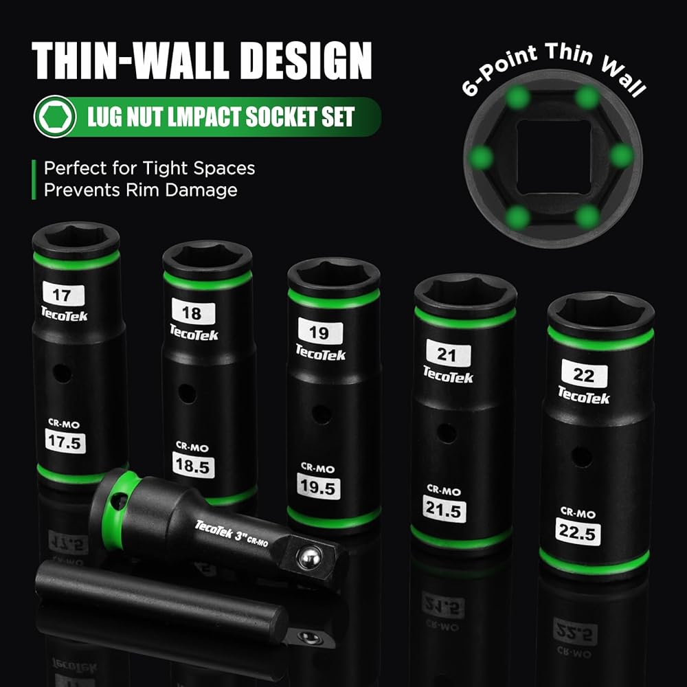 This TecoTek 7PCS 1/2" drive 1/2 size thin wall lug nut socket set is made of forged premium chrome molybdenum steel with a corrosion-resistant black phosphate finish to handle extreme levels of impact and torque changes. Half size sockets for easy removal of Damaged, Swollen and Stuck Lug Nuts. The thin wall construction grants superior access and maneuverability, letting you tackle those tough nuts with ease. The storage case has printed size and all drive tools have size markings on sockets for easy identification. Convenient for getting suitable size accessories, saving time and effort.