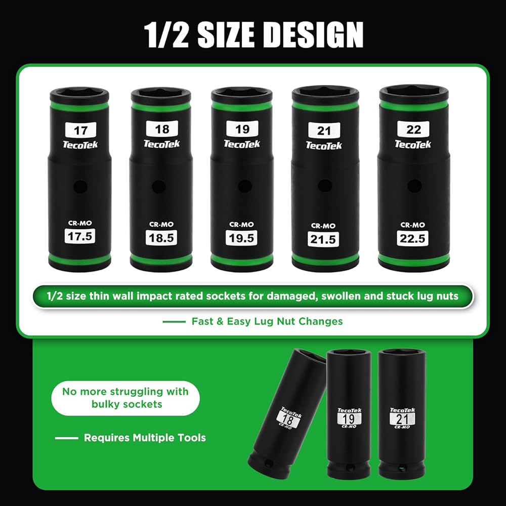 ✅【Size Include】This dual-sided socket kit has 2 sizes per socket for a total of 10 tire lug-nut sizes - 17mm x 17.5mm, 18mm x 18.5mm, 19mm x 19.5mm, 21mm x 21.5mm, and 22mm x 22.5mm– these sockets provide the perfect fit for tight spaces and challenging wheel designs