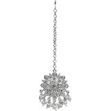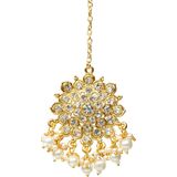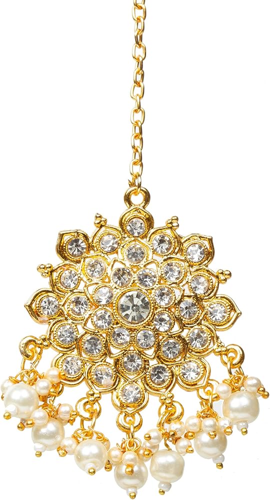 Presenting our stunning Indian chandbali style forehead tikka designed exclusively for women. This intricately crafted piece features gold plating adorned with white rhinestones and delicate pearl drops. The simple hair tikka chain ensures a lightweight and comfortable fit, making it ideal for weddings, bridal wear, Indian festivals, or gatherings. Embellished with kundan stones and bright white stones, this round dangler tikka exudes elegance and charm, complementing any attire with its timeless allure. Elevate your ensemble with this exquisite tikka, a perfect blend of traditional craftsmanship and contemporary style.