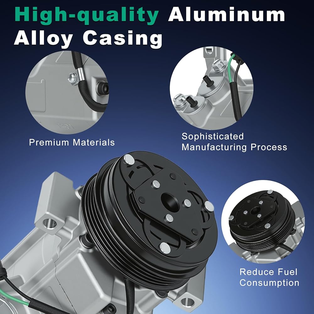 [Energy-Saving & Reliably Durable] Constructed from high-strength aluminum alloy, this air conditioning compressor runs with ultra-low noise and vibration for energy-saving cooling effect. Maintaining a steady driving speed can maximize fuel efficiency. Its sturdy build ensures stable, dependable performance and a much longer service life.