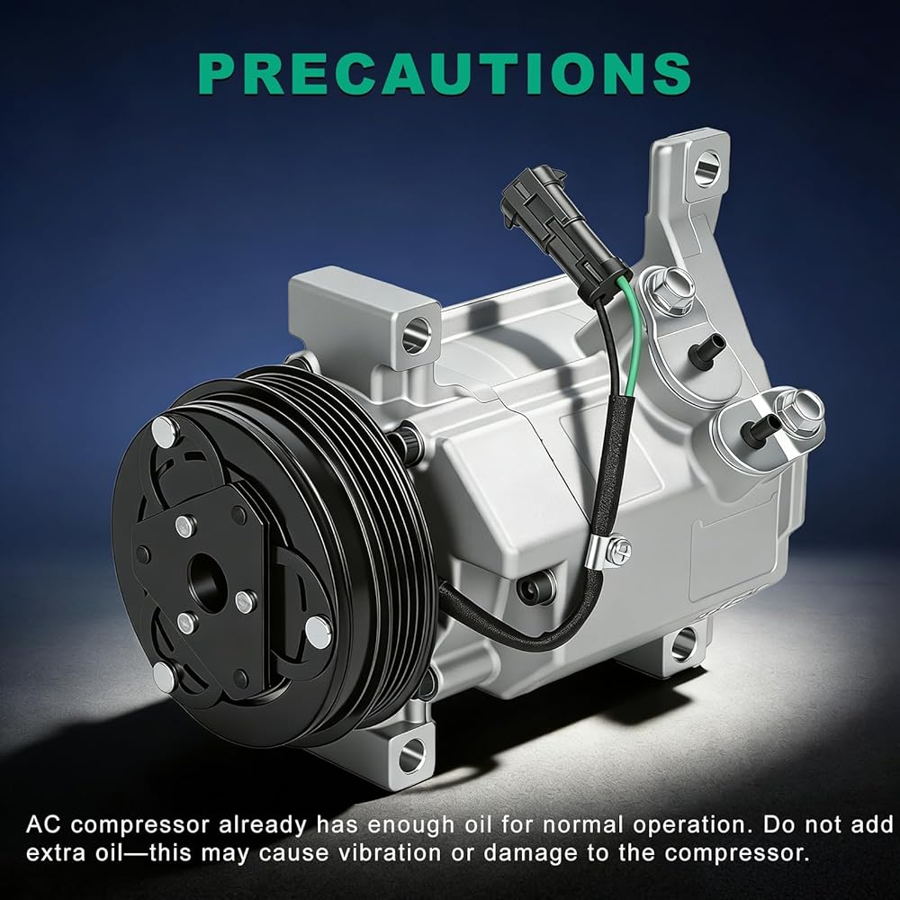 [High-Efficiency Cooling] This air conditioner compressor delivers robust compression pressure for rapid cooling airflow, ensuring a cool and comfortable driving experience. Note: Pre-lubricated at shipment—no initial oil refilling required. Charge refrigerant to 70-80% of the rated capacity (overfilling is not recommended).