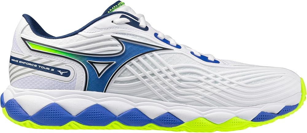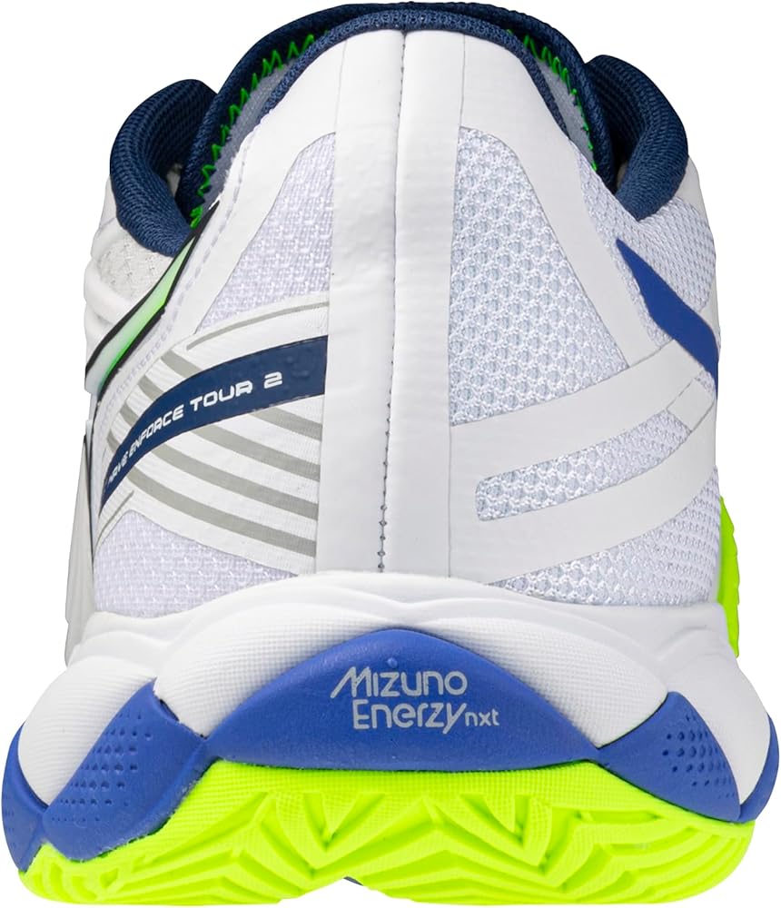 Designed for the advanced tennis or pickleball player, the all-new WAVE ENFORCE TOUR 2 AC is the ideal shoe for powerful competitors looking to enforce their will on their opponents. Equipped with the new MIZUNO ENERZY NXT foam throughout the footbed, the Enforce Tour 2 provides high energy return and plush cushioning for quick transitions without added weight. The DuRubber outrigger outsole supports forceful rotational movement, maximizing stroke power and footwork stability, and works in conjunction with a unique upper blend of CPU and mesh to produce a professional level of durability. The redesigned Dyna-Heel Lock system improves the fit and alignment of the ankle and heel, further enhancing stability and maneuverability. 6-MONTH OUTSOLE WARRANTY.