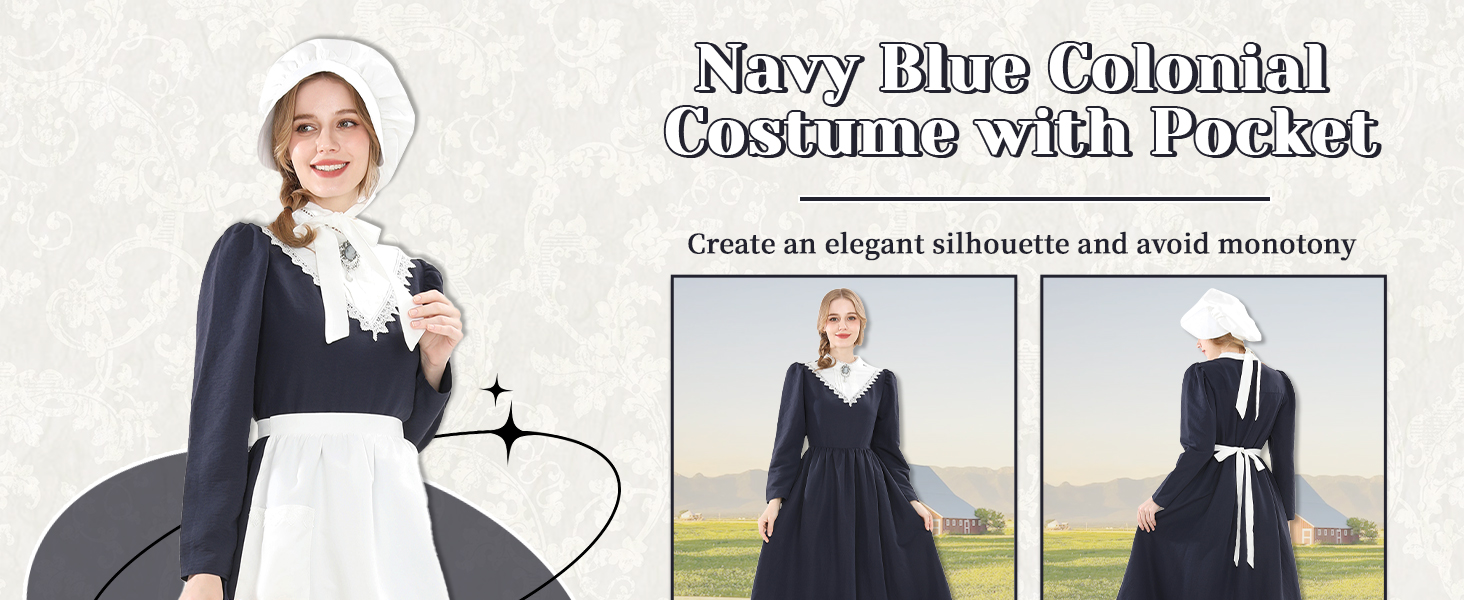 【Package】Womens pioneer dress including 3 pieces: long sleeve dress *1, pioneer apron *1, pioneer bonnet *1. Three exquisite pearl buttons adorn the back of the collar. A side zipper ensures easy on-and-off wear