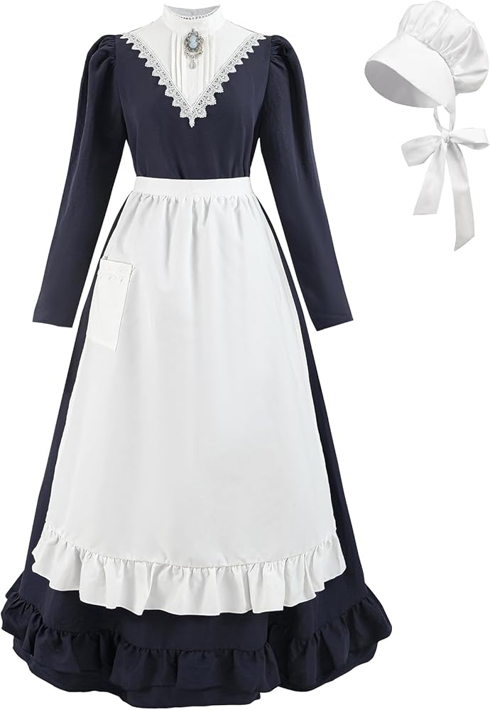 【Design】The womens colonial costume features a stand-up collar with a V-shaped white lace trim, complemented by a vintage brooch and a ruffled hem. The white apron includes pockets for conveniently storing eggs and other items. The pockets are further embellished with white lace trim, so lovely