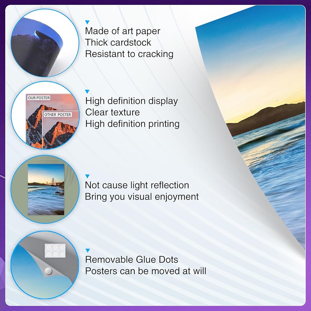 Dimensions: A3 Size 11.2 x 16.5 inch (28.5 x 42.0 cm), 8 pcs different images per pack with 100 glue dots which can help you paste the posters at will