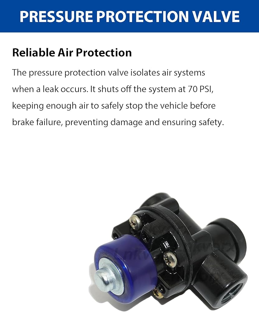 Reliable Air Protection - The pressure protection valve isolates air systems when a leak occurs. It shuts off the system at 70 PSI, keeping enough air to safely stop the vehicle before brake failure, preventing damage and ensuring safety.