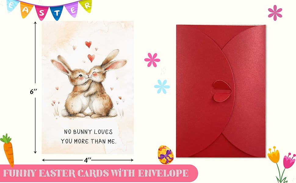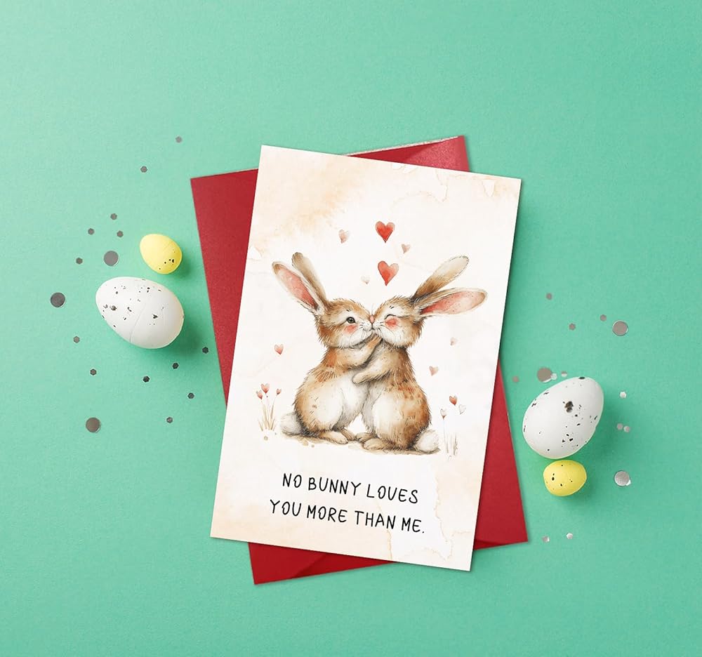 Easter Cards with envelope : This adorable Easter Greeting Card with Envelope features a charming rabbit design with the sweet message "No Bunny Loves You More Than Me." It's the perfect choice for spreading joy this Easter. Comes complete with a high-quality red envelope for easy gifting.