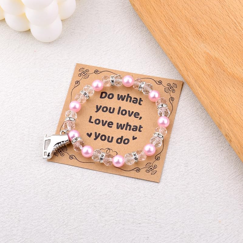 Perfect Skate Lovers Gift Idea: Skating bracelet features with pink, clear beaded and rhinestone beads, paired with a ice skate charm, great way showcase you love for ice skating, ideal ice skater birthday gift for women, skater appreciation bracelet gift for coach, figure skating gifts for skating lovers