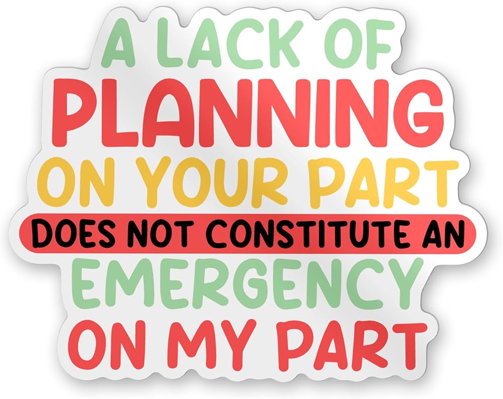 This funny and motivational sticker features the classic quote: “A Lack of Planning on Your Part Does Not Constitute an Emergency on My Part.” Made from high-quality vinyl, it's waterproof, durable, and perfect for decorating laptops, water bottles, notebooks, or workspaces. A great gift for coworkers, students, or anyone who appreciates a touch of humor with their productivity.
