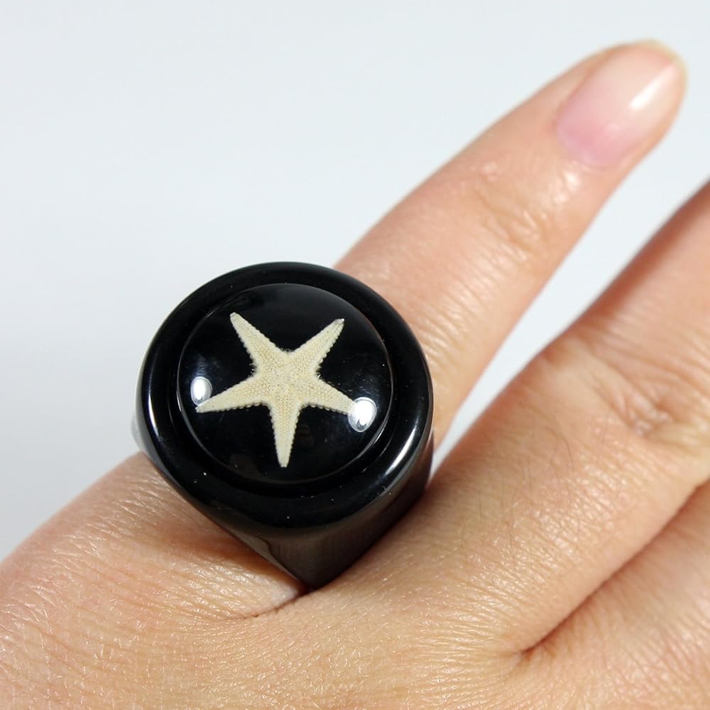 This black acrylic ring has a star fish encased in a clear acrylic with a black background. The ring is 1x1 3/16 in. in size. This black acrylic ring has a real Starfish encased in acrylic with black background. Size of Ring: 6
